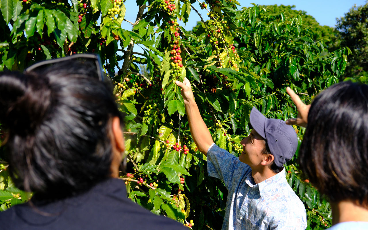 農園についてこの農園はただのコーヒーファームではなく、コナでも随一の絶景を楽しめる場所です。Mamalahoa highway沿いに位置する駐車場は当農園の敷地の最も標高が高く見晴らしの良い場所にあり、眼下にコナの街と海を眺めながら、500メートルの程の散策路を歩いていくと、途中で50種以上の草花や30種以上のフルーツの木々、さらにコーヒー畑の景観を楽しむことができます。 セルフガイドによる楽しみ方とガイド付きの楽しみ方があります。セルフガイドは入園料5ドル/人で営業時間中はどなた様も予約不要でガーデン散策やコーヒーフィールド見学、コーヒーの試飲などの体験をお楽しみいただけます。ガイド付きのツアーはより深く体験をお楽しみいただけます。ガイド付きツアーの詳細は以下をご確認下さい。 概要当農園のガイド付き散策ツアーは、ハワイ島の美しい自然と文化を体感できるプログラムです。スタ ッフが同行し、園内に咲き誇る花々、フルーツの木々、そしてコーヒーの木について解説します。植 物の特徴や歴史、生活に役立つ豆知識を交えながら散策を楽しめるのが魅力です。 ツアーの特徴